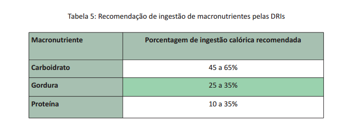 A substituição de alimentos de origem animal pelos de origem vegetal costuma alterar a proporção de macronutrientes da dieta, mas ela se mantém dentro das proporções sugeridas pelas DRIs (Dietary Reference Intakes) nos estudos populacionais que quantificaram essa ingestão. O profissional nutricionista, com o conhecimento do teor de macronutrientes dos alimentos, deve auxiliar o paciente a escolhê-los e a fazer modificações para ajustar as necessidades diante de condições clínicas específicas. A recomendação das DRIs [92] para o percentual de ingestão dos macronutrientes está na Tabela 5: