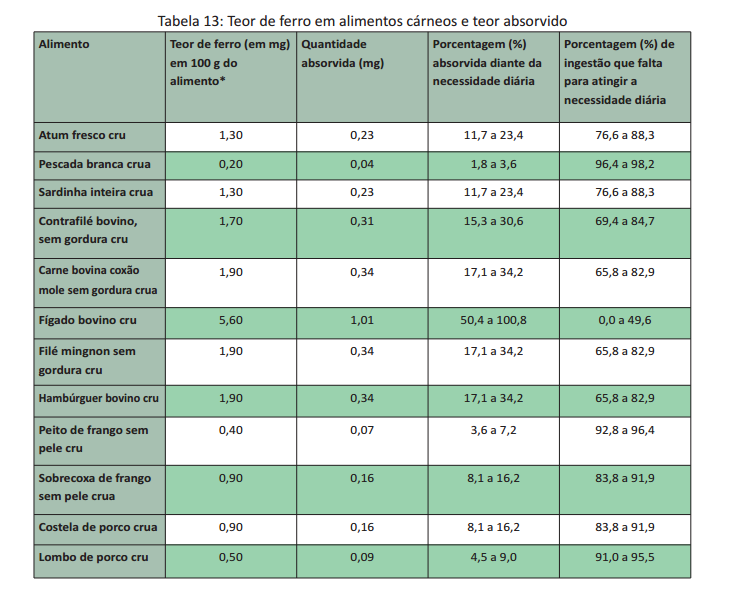 O ferro heme, pela presença do anel porfirínico, preserva a absorção constante do mineral no trato gastrointestinal humano, que varia de 15% a 35% . O ferro não heme preserva absorção entre 2 e 20%. O único fator de inibição de absorção do ferro heme é o cálcio. A vitamina C, os ácidos orgânicos e os demais fatores estimulantes da absorção do ferro não-heme não potencializam a absorção do ferro heme . Como o consumo de carne considerado saudável pelas diretrizes atuais é minimizado, a ingestão preconizada do mineral não pode ser atingida com a ingestão de carne pelos que a consomem. A tabela abaixo mostra o teor de ferro em 100 gramas dos alimentos (quantidade máxima de ingestão diária preconizada para onívoros, segundo o Ministério da Saúde ), o que seria absorvido (considerando-se que a biodisponibilidade de ferro dos alimentos cárneos é de 18%) e a necessidade de absorção humana (1 a 2 mg/dia) para a manutenção do nível orgânico do mineral em situação de equilíbrio metabólico.