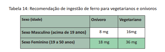 Dessa forma, é importante que o nutricionista procure sempre adequar a dieta com base nos fatores que otimizam e inibem a absorção do ferro não heme, pois serão sempre fundamentais para atingir a necessidade diária na dieta saudável de quem come ou não carne. As DRIs sugerem prescrição de ferro diferente para vegetarianos e não vegetarianos, com base em estudos populacionais que indicam que a biodisponibilidade média de ferro na dieta vegetariana é de 5 a 12%, contra 14 a 18% na dieta onívora . Sendo assim, para absorvermos 1 a 2 mg de ferro, considerando a absorção máxima das dietas, seria importante a ingestão de 5,5 a 11,1 mg de ferro na dieta onívora e 8,3 a 16,6 mg na dieta vegetariana. As DRI estipulam uma margem de segurança exagerada, pois se a mulher vegetariana necessita absorver 2 mg de ferro, ela necessitaria ingerir 16,6 mg de ferro. As DRIs sugerem que o profissional de saúde prescreva para o vegetariano o dobro do que prescreveria para o onívoro (Tabela 14).