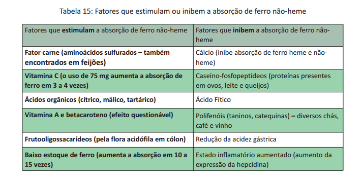 Dificilmente se atingirá a recomendação de ferro das DRIs para mulheres vegetarianas, mas isso não é problema, já que um conjunto de 15 estudos demonstrou prevalência idêntica de anemia ferropriva em mulheres onívoras e vegetarianas. Outro estudo demonstrou que a prevalência de deficiência de ferro em mulheres que comiam carne vermelha foi de 60% contra 40% da mesma deficiência em ovolatovegetarianas . Isso é justificável pela perda sanguínea menstrual, que pode diferir de uma mulher para outra. No item “RECOMENDAÇÃO DE INGESTÃO PARA GRUPOS ALIMENTARES”, observe como substituir a carne pelos feijões para obter a mesma absorção final de ferro, mesmo sem o uso de vitamina C. Os principais fatores que estimulam ou inibem a absorção de ferro não-heme estão na tabela 15: