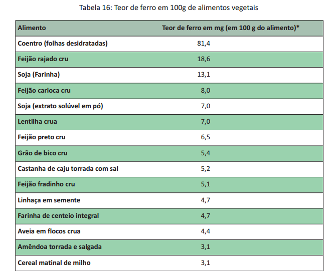 O uso de fibras purificadas em doses muito elevadas tem interferência mínima na absorção de minerais da dieta. O efeito inibitório da absorção de ferro em alimentos ricos em fibra não se deve a elas mas ao ácido fítico, efeito que pode ser minimizado com métodos culinários . A vitamina C é um dos estimuladores mais potentes de absorção do ferro, se contrapondo com o efeito inibitório dos polifenóis, fitato, cálcio e caseino-fosfatopeptídeos, sendo, por isso, importante estar presente sempre que houver ou não houver esses compostos na dieta . O uso de panela de ferro aumenta o teor de mineral nos alimentos, mas sua quantidade é incerta. A prática de utilizar panela de ferro pode ter efeito preventivo, mas não servirá de tratamento da deficiência . Na maioria dos estudos, os indivíduos que adotam a dieta vegetariana têm ingestão igual ou superior à observada em onívoros . Isso é justificável pelo elevado teor de ferro dos alimentos que formam a base da dieta vegetariana, conforme a Tabela 16.
