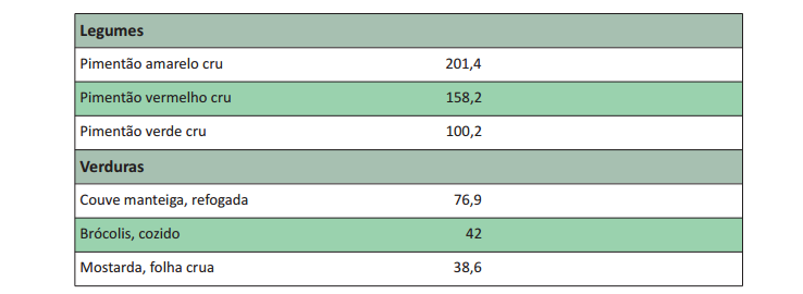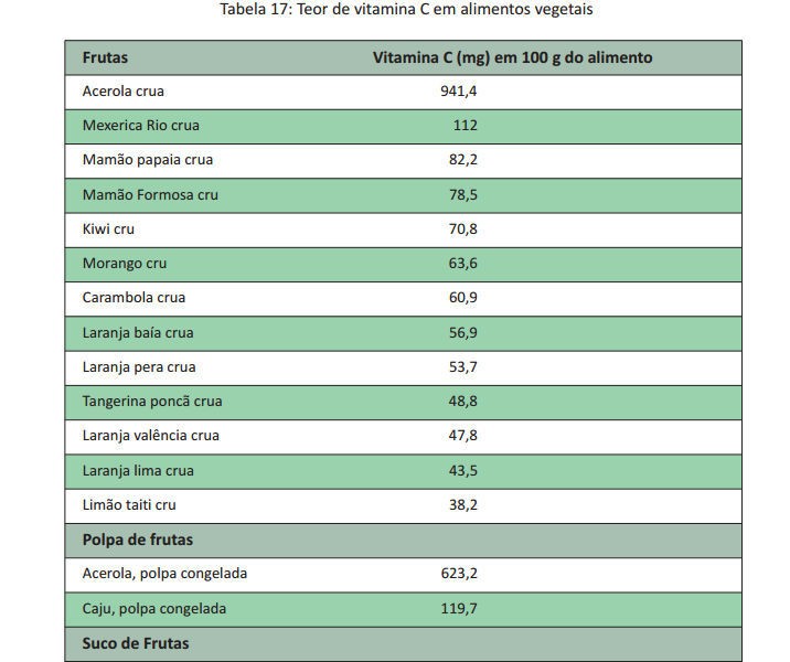 Estudos com grupos de vegetarianos mostram ingestão de vitamina C muito superior à encontrada em onívoros. Nos vegetarianos, o valor sérico de vitamina C também é maior do que em onívoros . Os alimentos mais ricos em vitamina C estão na Tabela 17: