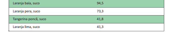 Tangerina poncã, suco; laranja-Baía, suco; laranja-da-terra, suco; laranja-lima, suco; laranja-pera, suco; laranja-valência, suco; limão-galego, suco; uva, suco concentrado envasado; água de coco; caldo de cana.