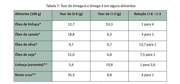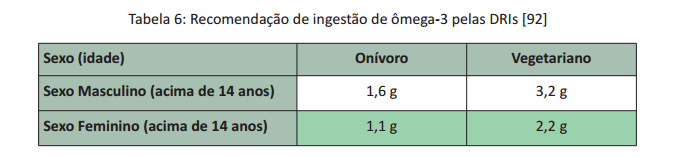 A ingestão de ômega-3 (Ω-3) na dieta vegetariana não costuma ser problema, mas quando a ingestão de ômega-6 (Ω-6) é excessiva, a conversão do Ω-3 nas formas ativas (EPA – ácido eicosapentaenoico e DHA –ácido docosahexaenoico) pode ficar comprometida. A alteração encontrada na literatura em relação a baixos níveis de Ω-3 na dieta vegetariana é a redução do tempo de coagulação, corrigida com ajustes alimentares. Pelo fato de o Ω-3 ter de se converter em EPA e DHA (fatores já encontrados nos peixes e em alguns poucos alimentos de origem animal), as DRIs determinam que, na dieta vegetariana, deve-se prescrever o dobro do que se prescreve para onívoros, conforme visto na Tabela 6:
