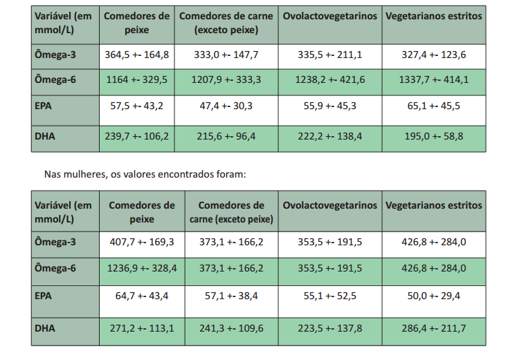 No entanto, como a dieta habitual do brasileiro não inclui boas fontes de ômega-3, a adequação nutricional de onívoros e vegetarianos é similar. Estudo realizado com homens e mulheres com cerca de 60 anos e sobrepeso, comparando 12.210 indivíduos que comiam peixe, 1.934 que comiam carnes (exceto peixe), 250 ovolactovegetarianos e 28 vegetarianos estritos, demonstrou que a ingestão de ômega-3 era maior nos que comiam peixe, seguido pelos ovolactovegetarianos, os que comiam carne (exceto peixe) e os vegetarianos estritos. No grupo masculino, a ingestão diária média de ômega-3 era de 1,57 g para os comedores de peixe, 1,27 g para os ovolactovegetarianos, 1,15 g para os comedores das demais carnes e 1,04 g para os vegetarianos estritos. No grupo feminino, a ingestão encontrada foi de 1,27 g para as comedoras de peixe, 0,98 g para as ovolactovegetarianas, 0,91 g para as vegetarianas estritas e 0,89 g para as comedoras das demais carnes. Na avaliação do nível plasmático, encontramos a seguinte variação nos homens: