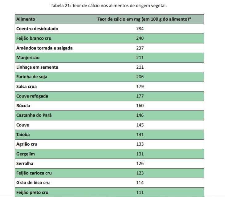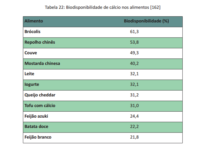 Os leites vegetais enriquecidos têm cerca de 240 mg de cálcio em 200 mL, quantidade idêntica ao leite de vaca. Apesar de nutritivos, os leites vegetais caseiros à base de amêndoas, gergelim, sementes de girassol, castanhas do Pará contêm baixo teor de cálcio, pois essas sementes têm menos de 240 mg (algumas, 150 mg) de cálcio em cerca de 600 kcal. A biodisponibilidade de cálcio varia de acordo com os diversos alimentos e, mesmo no reino vegetal, pode ser elevada, principalmente quando o alimento for pobre em ácido oxálico (Tabela 22):