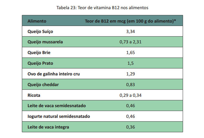 Algas não devem ser utilizadas como fonte de B12. Um estudo com 326 algas demonstrou que 171 delas contêm B12 obtida por processo simbiótico com bactérias, mas que, na totalidade ou quase, é metabolicamente inativa em mamíferos . As algas nori e chlorella são as mais ricas, mas a B12 contida nelas é considerada análoga ou corrinóide (na totalidade ou na maior parte), pois estudos clínicos não demonstram eficácia em cumprir a função da verdadeira vitamina: apesar de o consumo aumentar o nível sérico da vitamina, o volume corpuscular médio (VCM) se eleva. O resumo (abstract) de um estudo informa que a chlorella é uma boa fonte de vitamina B12 ativa, mas o corpo do trabalho não demonstra isso . Da mesma forma, não se devem utilizar como fontes de B12 alimentos fermentados (misso, tempê, shoyu), levedura de cerveja nem espirulina. As únicas fontes confiáveis de B12 são carnes, ovos, leite, queijos, alimentos enriquecidos e suplementos. A vitamina B12 dos suplementos é obtida por cultura de bactérias em laboratório. Não há toxicidade por uso excessivo de vitamina, seja proveniente de suplementos, seja de alimentos enriquecidos A recomendação de ingestão de vitamina B12 para seres humanos após os 14 anos de idade (fora do período de gestação ou lactação) é de 2,4 mcg/dia, sendo a necessidade de absorção de 1 mcg/dia. Seu teor nos alimentos pode ser visto na Tabela 23: