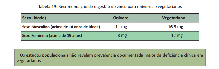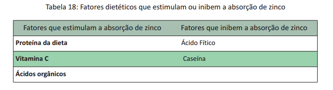 O cálcio não tem efeito inibitório direto sobre a absorção do zinco, mas pode potencializar o efeito inibitório do ácido fítico. De forma inversa, a vitamina C e a proteína da dieta podem reduzir o efeito do ácido fítico . A biodisponibilidade de zinco na dieta é considerada alta (50% a 55%), moderada (30% a 35%) ou baixa (15%) de acordo com a presença de proteínas animais e de alimentos com alto teor de ácido fítico. A dieta vegetariana costuma apresentar teor moderado de absorção de zinco, mas, como medida de segurança, as DRIs estabeleceram a recomendação de ingestão com base em dietas de baixa biodisponibilidade, o que subestima essa absorção. Dessa forma a recomendação de prescrição dietética pelas DRIs é de 50% acima do prescrito para onívoros (Tabela 19):