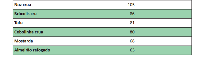 Grande parte dos leites de soja encontrados no mercado brasileiro são enriquecidos com cálcio e oferecem cerca de 240 mg por 200 ml. Nos Estados Unidos e em países europeus há leites de diversas sementes (amêndoas, arroz, gergelim) enriquecidos com cálcio. Muitos desses leites são encontrados no Brasil, mas alguns ainda com preço pouco acessível para a maioria da população. Também encontramos no Brasil o leite de aveia enriquecido com cálcio. É possível atingir a ingestão recomendada de cálcio com a dieta vegetariana estrita, mas isso se torna muito mais fácil com o uso de alimentos enriquecidos c O ácido oxálico é o principal fator antinutricional que se deve controlar para melhorar a absorção do cálcio. Isso significa evitar os alimentos mais ricos em ácido oxálico (espinafre, acelga, folhas de beterraba e cacau) nas refeições mais ricas em cálcio, pois para reduzi-lo não bastam os métodos culinários. A moderação do consumo de sal é fator importante para a manutenção do cálcio corporal, pois a cada 2.300 mg de sódio ingerido são eliminados pela urina 40 a 60 mg de cálcio. A manutenção da flora intestinal acidófila aumenta a absorção de cálcio no cólon ascendente . A redução do teor de ácido fítico dos alimentos também ajuda a melhorar a absorção . Os alimentos com maior teor de cálcio e menor teor de ácido oxálico são (Tabela 21):