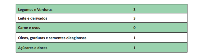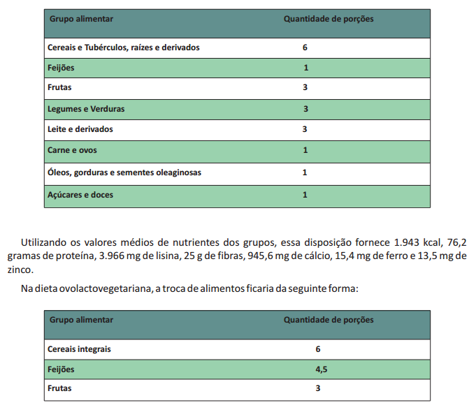 A quantidade de calorias oriunda de cada grupo alimentar é apenas um guia para dar ao nutricionista um parâmetro básico na prescrição dietética. As recomendações genéricas não substituem a avaliação e a prescrição individual que deve ser feita após avaliação e diagnóstico nutricional. Diversos guias e pirâmides alimentares foram publicados para a população vegetariana, mas muitos não se adéquam à realidade brasileira. Dessa forma, optamos por fornecer as recomendações baseadas nas porções oficiais preconizadas pelo Ministério da Saúde , fazendo sua adaptação para a dieta vegetariana.