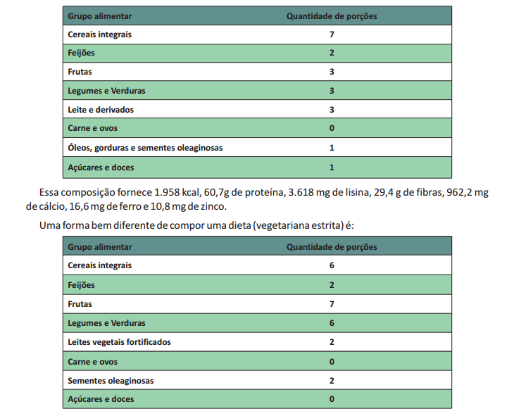 Essa composição fornece 1.946 kcal, 65,5 g de proteína, 4.051 mg de lisina, 36,8 g de fibras, 979 mg de cálcio, 17,6 mg de ferro, 11,3 mg de zinco. Na dieta vegetariana estrita, a troca do leite de vaca por leite vegetal enriquecido com cálcio fornecerá o mesmo teor de cálcio do cardápio acima. Esse padrão básico de elaboração da dieta pode ser modificado de várias formas, lembrando que deve haver pelo menos 2 porções do grupo de feijões na dieta vegetariana estrita. Mesmo uma dieta com maior teor de cereais oferece a quantidade proteica preconizada: