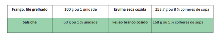Assim, a carne vermelha (190 kcal) é substituída por 3,5 porções de feijão ou 7 colheres de sopa de alimentos cozidos do grupo dos feijões. Outras possibilidades de equivalência para a substituição da carne por feijões podem ser vistas na Tabela 26.