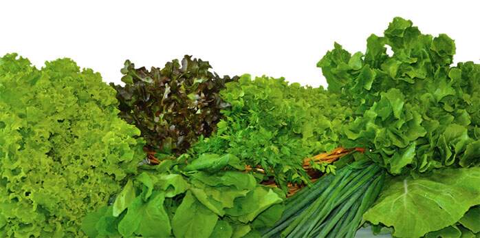 Acelga crua; agrião cru; aipo cru; alface americana crua; alface crespa crua; alface lisa crua; alfavaca crua; almeirão cru; almeirão refogado; brócolis cozido; brócolis cru; catalonha crua; chicória crua; couve-manteiga crua; couve-manteiga, refogada; couve-flor crua; couve-flor cozida; espinafre cru; espinafre refogado; broto de feijão cru; mostarda em folha crua; repolho branco cru; serralha crua; taioba crua; manjericão cru; salsa crua; cebolinha crua.