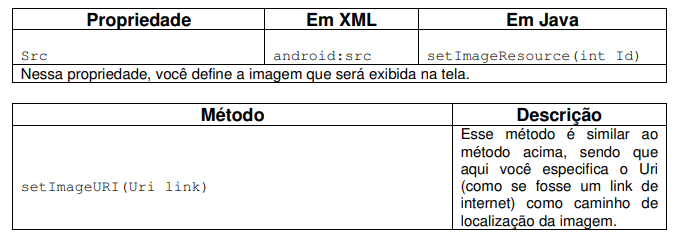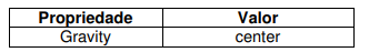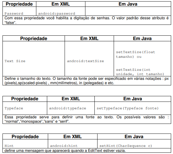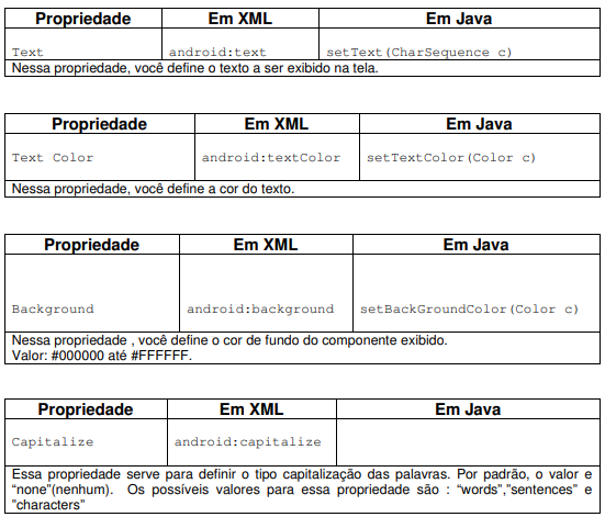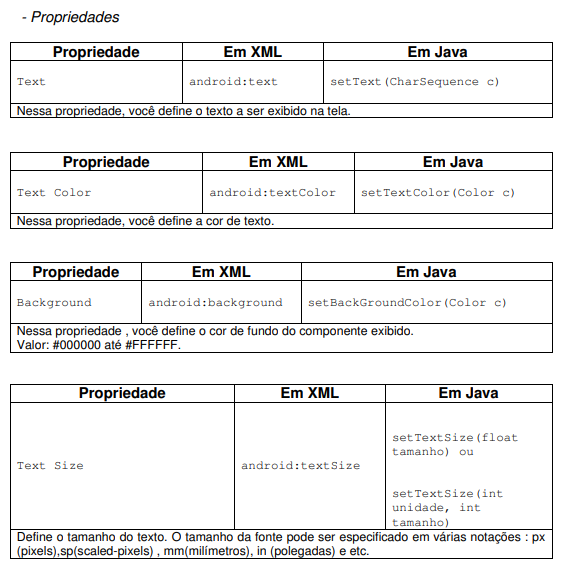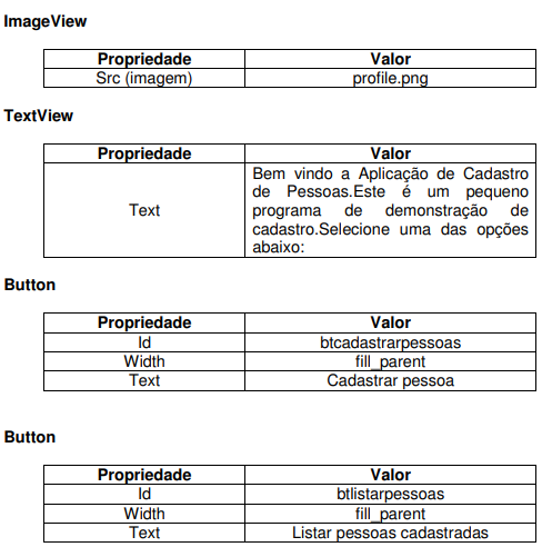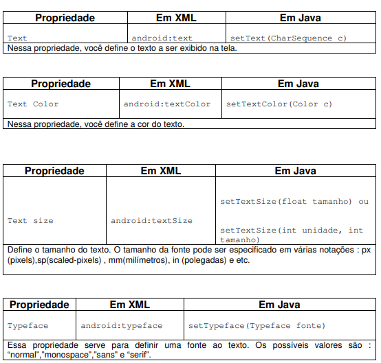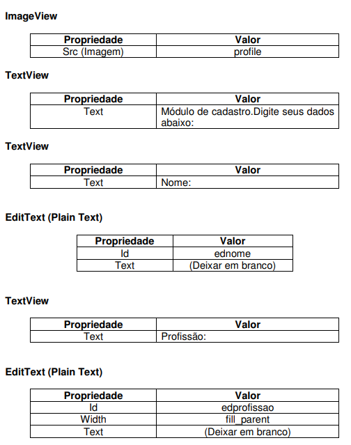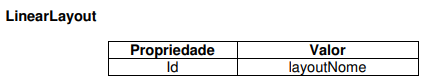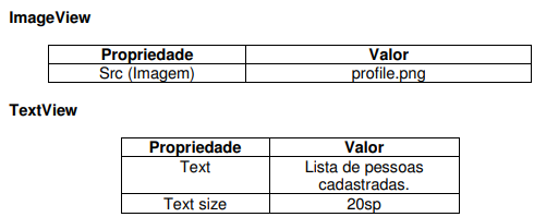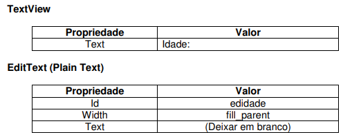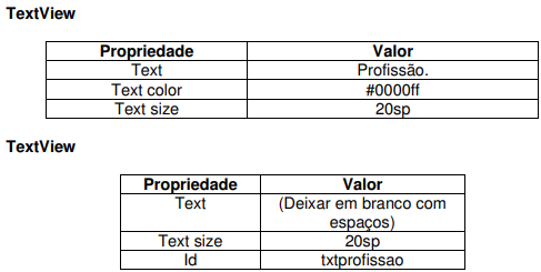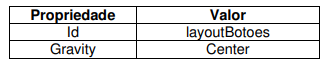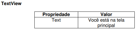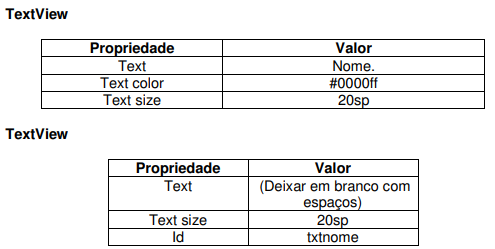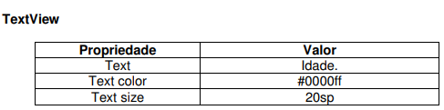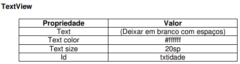 Altere a estrutura de layout da sua aplicação para o LinearLayout e em seguida altere o componente TextView de acordo com a tabela abaixo.