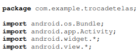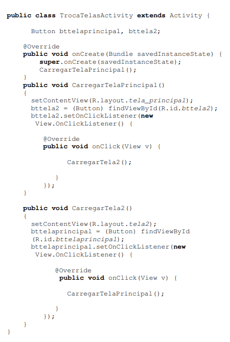 Agora vamos no arquivo “TrocaTelasActivity.java” para digitarmos o código abaixo: