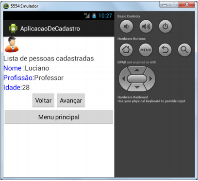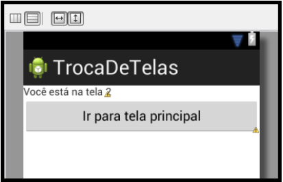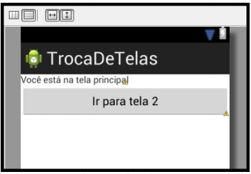 Observe que nesta classe criamos dois métodos:CarregaTelaPrincipal e CarregaTela2. Para toda aplicação que utilize mais de um layout (tela), o carregamento dos layouts e de seus respectivos widgets devem estar separados em funções desenvolvidas para esse propósito. Logo, o método CarregaTelaPrincipal carrega o layout principal e seus respectivos componentes, o mesmo válido para o método CarregaTela2, que carrega o layout da tela 2 e seus respectivos componentes. Feito isso, execute a aplicação. Veja o resultado abaixo: