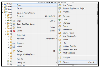 Para criarmos um novo arquivo XML dentro do diretório “layout” basta clicar com o botão direito sobre a pasta e em seguida clicar em “New” e logo após “Other”, confira na figura abaixo: