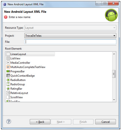 Por padrão a estrutura de layout padrão selecionada é LinearLayout (que será a estrutura que iremos usar). Agora no campo “File” digite “tela2” e em seguida clique em “Finish” para que o arquivo seja gerado. Veja o resultado na figura seguinte: