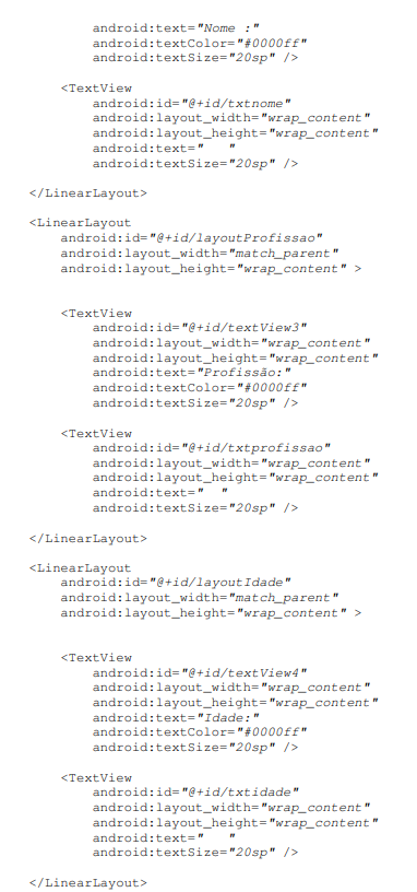 Agora dentro da estrutura “layoutProfissao” vamos adicionar os seguintes componentes na sequência: