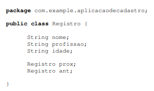 Conforme já havia falado, para esse programa vamos trabalhar com uma estrutura de dados do tipo “lista” (duplamente encadeada). Para organizarmos de uma forma mais clara o armazenamento dos dados na memória, irei criar uma classe que vai representar o “registro” das informações na memória. A classe que iremos criar vai se chamar Registro. Essa classe vai estar dentro do mesmo pacote onde se encontra o arquivo “AplicacaoCadastroActivity.java” (neste caso, o pacote “com.example.aplicacaodecadastro”). Depois de criarmos a classe, vamos escrever o seu código conforme é mostrado em seguida: