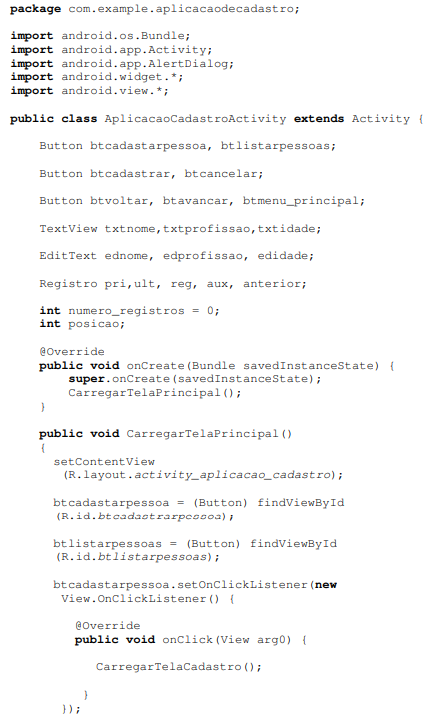 Agora no arquivo “AplicacaoCadastroActivity.java” vamos colocar o seguinte código abaixo:
