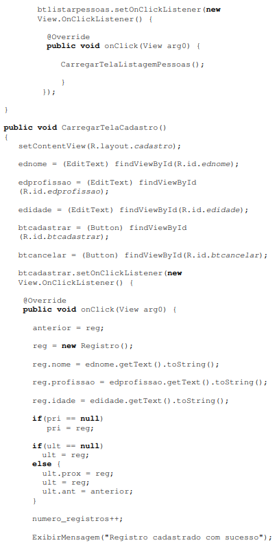 Vamos analisar alguns trechos importantes de código do método CarregarTelaCadastro. Se você observar nessa aplicação, foram declarados cinco variáveis : pri,ult , reg , aux e anterior ( todas elas do tipo Registro). Irei descrever aqui a finalidade de cada variável: