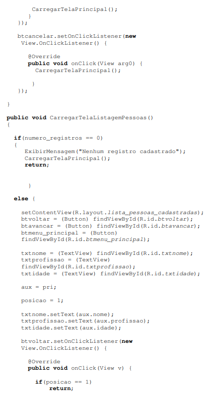 Agora iremos entender aos poucos os códigos dessa aplicação.Observe que nessa aplicação ou possuo três métodos: o método CarregarTelaPrincipal (responsável por carregar a tela principal), o método CarregarTelaCadastro (responsável por carregar a tela de cadastro) e o método CarregarTelaListagemPessoas (responsável por carregar a tela de listagem dos usuários cadastrados).