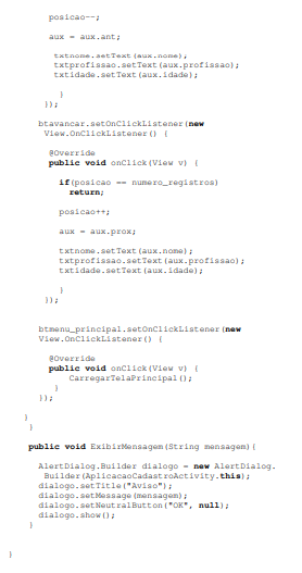 Retorna para aux o endereço do registro anterior. Depois disso são executados instruções para que os dados possam ser exibidos.Já no método onClick do botão btavancar, antes de passar para o próximo registro, verifico se já está no último registro pela instrução: