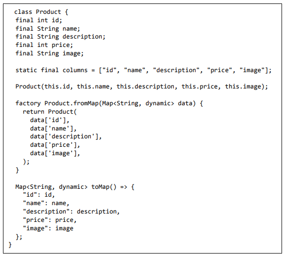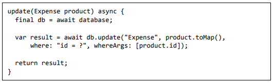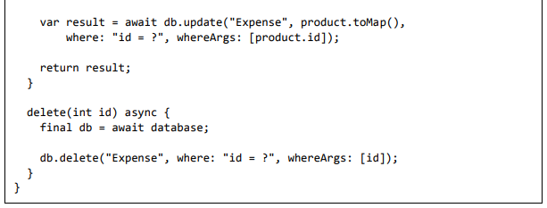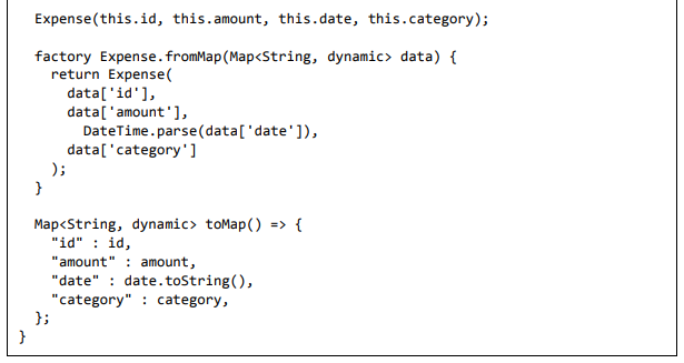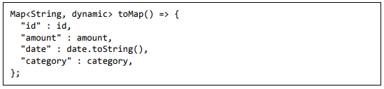 • toMap - Usado para converter o objeto de despesa em Dart Map, que pode ser usado posteriormente na programação do banco de dados