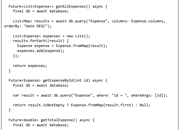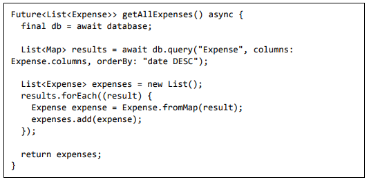 • Obtenha todas as despesas disponíveis no banco de dados usando o método getAllExpenses. Ele será usado para listar todas as informações de despesas do usuário.