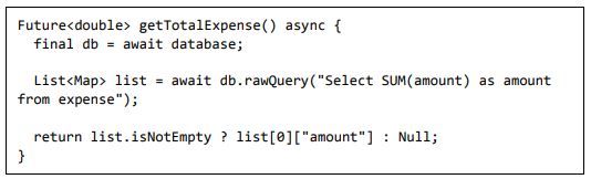 • Obtenha o total de despesas do usuário usando o método getTotalExpense. Ele será usado para mostrar a despesa total atual para o usuário.