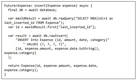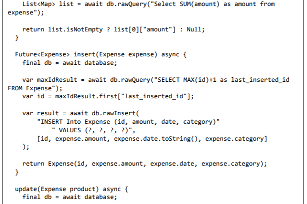 • Adicionar novas informações de despesas ao banco de dados usando o método de inserção. Ele será usado para adicionar novas entradas de despesas no aplicativo pelo usuário.