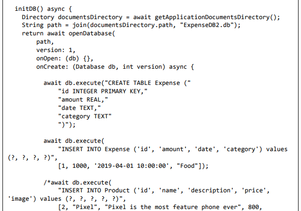 • O objeto despesas carrega todas as informações de despesas do usuário do banco de dados. Além disso, quando o aplicativo for aberto pela primeira vez, ele criará o banco de dados necessário com as tabelas adequadas.