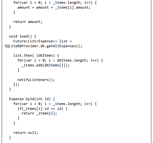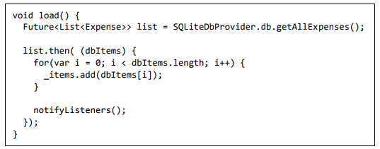 • load - Usado para carregar as despesas completas do banco de dados e na variável _items. Ele também chama notifyListeners para atualizar a IU.