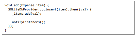 • add - Usado para adicionar um novo item de despesa na variável _items, bem como no banco de dados. Ele também chama notifyListeners para atualizar a IU.