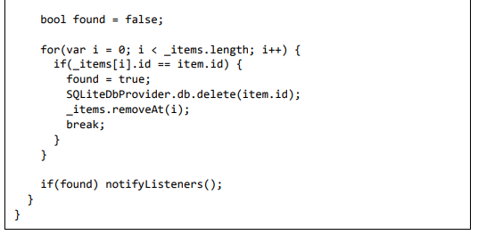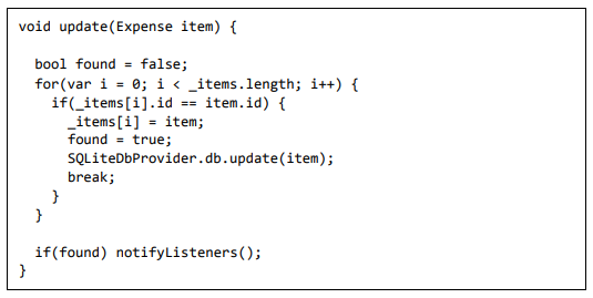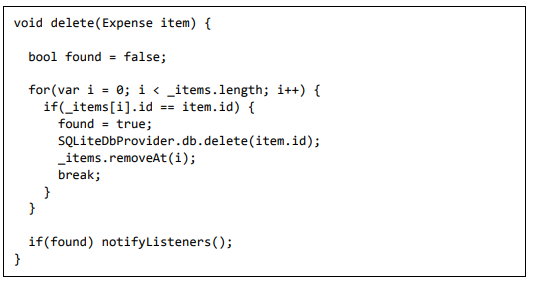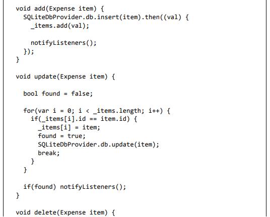 • delete - Usado para remover um item de despesa existente na variável _items, bem como do banco de dados. Ele também chama notifyListeners para atualizar a IU.