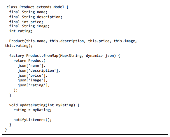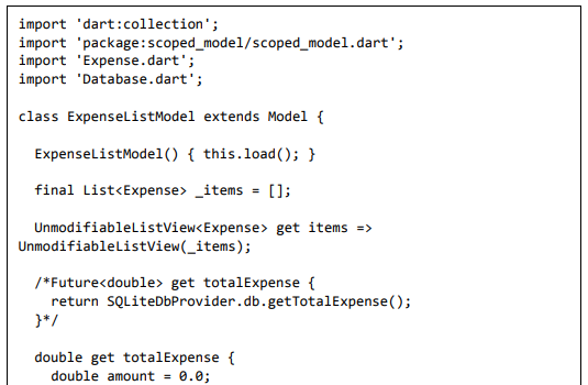 • Crie um novo arquivo, ExpenseListModel.dart para criar ExpenseListModel. O objetivo do modelo é manter as informações completas das despesas do usuário na memória e atualizar a interface do usuário do aplicativo sempre que as despesas do usuário mudarem na memória. É baseado na classe Model do pacote scoped_model. Possui as seguintes propriedades e métodos: