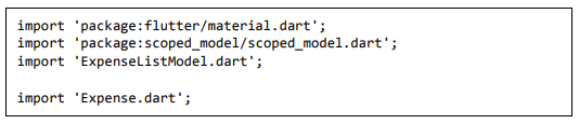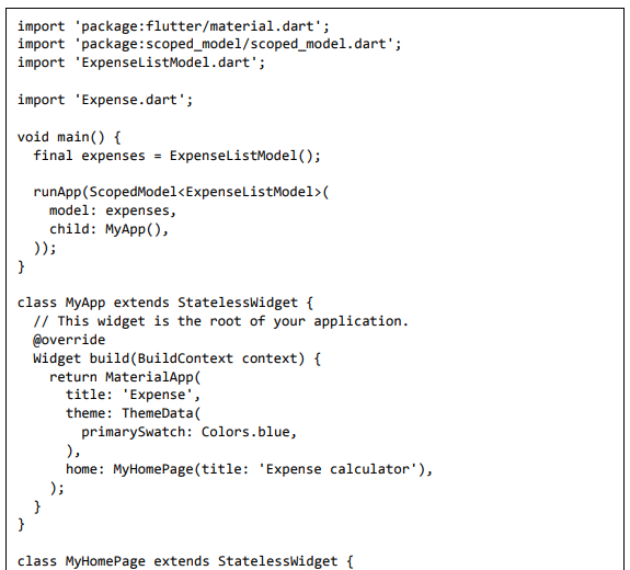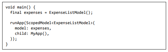 • Adicione a função principal e chame runApp passando o widget ScopedModel<ExpenseListModel>.