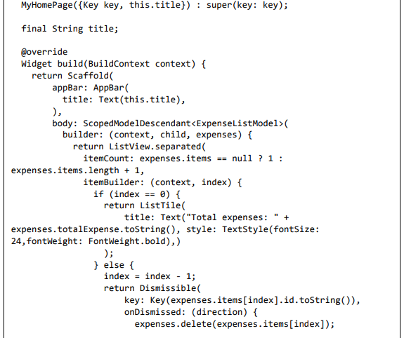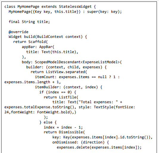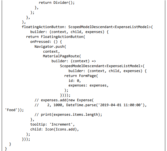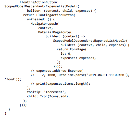 • ScopedModelDescendant é usado para passar o modelo de despesa para o widget ListView e FloatingActionButton.