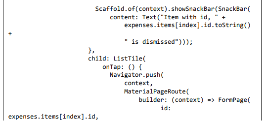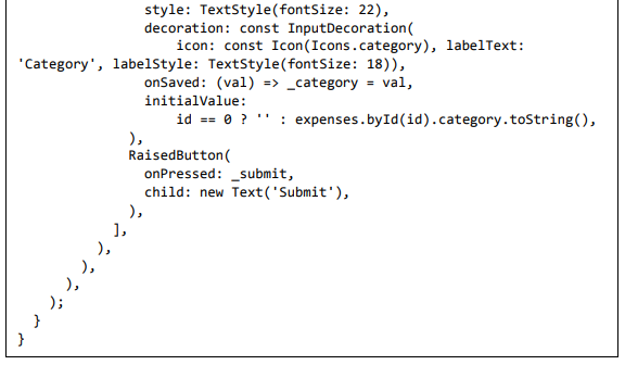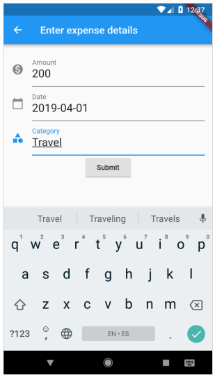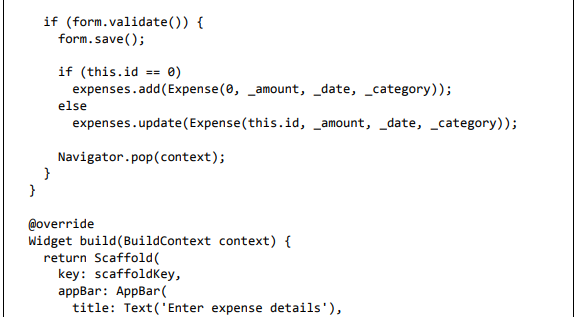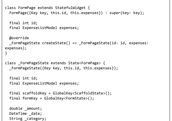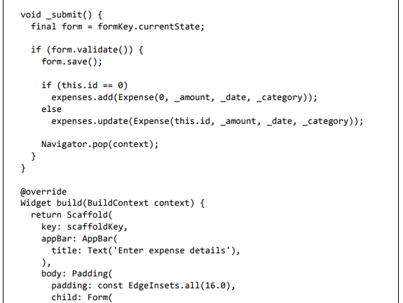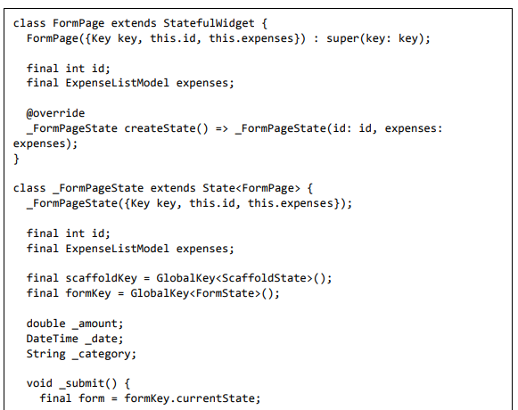• Crie um widget FormPage. A finalidade do widget FormPage é adicionar ou atualizar uma entrada de despesa. Ele também lida com a validação de entradas de despesas.