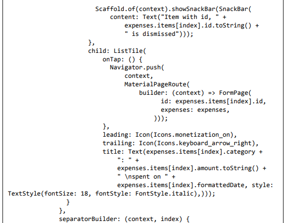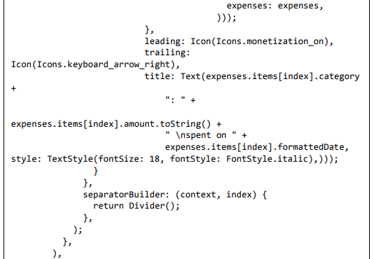 • Os widgets ListView.separated e ListTile são usados para listar as informações de despesas.