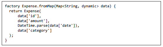 • fromMap - Usado para mapear o campo da tabela do banco de dados para a propriedade no objeto de despesa e para criar um novo objeto de despes.