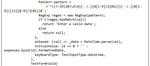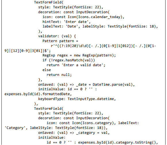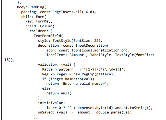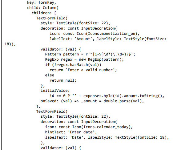 • A propriedade validator de TextFormField é usada para validar o elemento de formulário junto com os padrões RegEx.