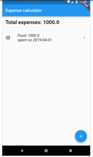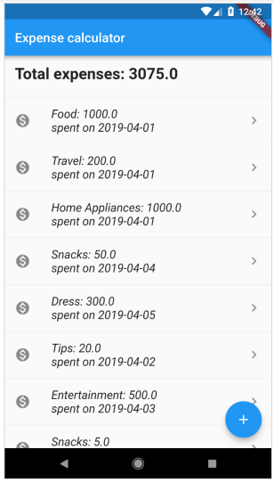 • Crie o widget MyHomePage para exibir todas as informações de despesas do usuário junto com as despesas totais na parte superior. O botão flutuante no canto inferior direito será usado para adicionar novas despesas.