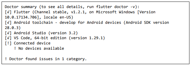 Etapa 4: Flutter fornece uma ferramenta, flutter doctor para verificar se todos os requisitos de desenvolvimento de flutter são atendidos.