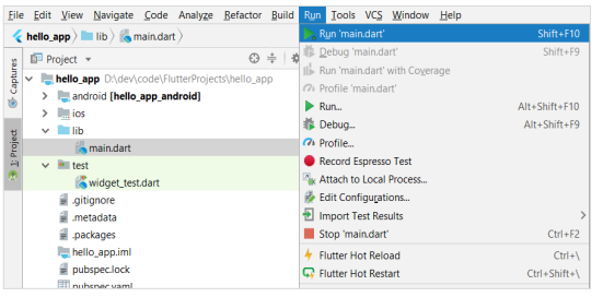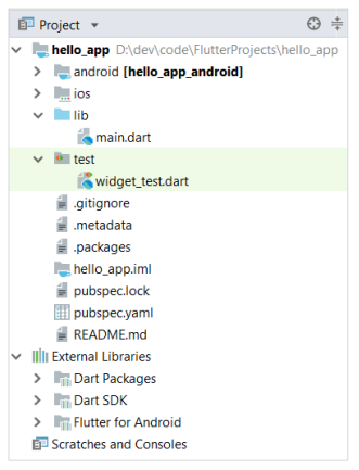 O Android Studio cria um aplicativo flutter totalmente funcional com funcionalidade mínima. Vamos verificar a estrutura do aplicativo e, em seguida, alterar o código para realizar nossa tarefa.