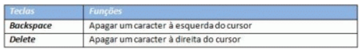 É normal durante a criação de um documento, a necessidade de realizar mudanças como apagar uma palavra ou determinado trecho do texto. Mesmo após termos finalizado e fechado o documento, podemos visualizá-lo novamente e fazer algumas modificações, acrescentar ou alterar textos. Veja na tabela as duas principais teclas utilizadas para apagar ou alterar um texto.