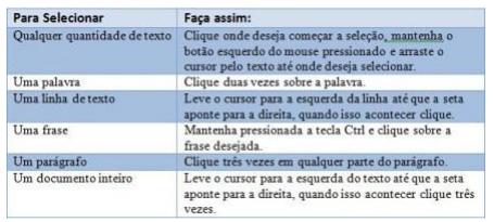 Como mostra a tabela acima, existe uma maneira fácil de selecionar apenas uma palavra, que é clicando duas vezes sobre ela.