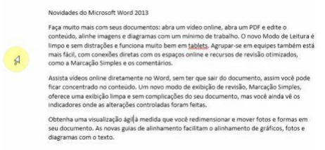 Para facilitar essa seleção, o Word 2013 possui uma área que chamamos de Área de Seleção, ao posicionar o mouse sobre essa área a seta fica inclinada para a direita, aguardando que o parágrafo ou a linha seja selecionada.