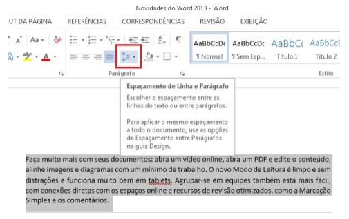 Aprenderemos agora o recurso de Espaçamento de Linha e Parágrafo. Existem diversas opções de espaço entre as linhas e também podem ser adicionados ou removidos espaços entre os parágrafos. Esse botão encontra-se ao lado dos botões de alinhamento.